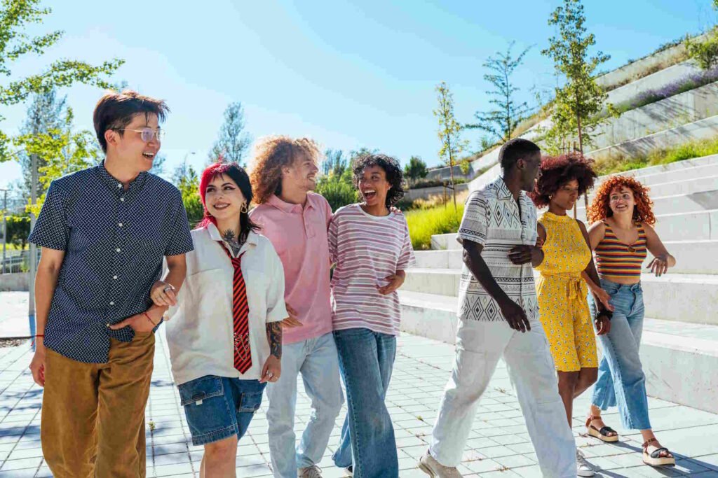 Multiethnic group of young friends meeting and having fun outdoors – Multiracial happy and stylish teen students bonding in the city, concepts about youth, teenagers lifestyle and diversity
